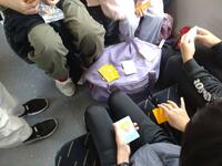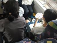| 修学旅行団体専用列車に乗ります。 | 車内では、トランプなどカードゲームをして楽しんでいます。 |
