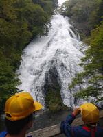 | 湯滝に来ました。マイナスイオンをたっぷり浴びています!二宮と比べ、かなり気温が低いです。 | 華厳の滝に来ました。高さ97mの岸壁から一気に水が落下する豪快な流れに見とれています✨ |