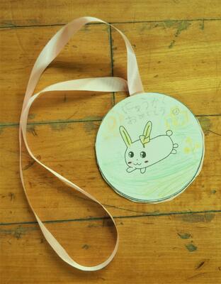 そして、4年生の「はじめの言葉」で会がスタート。その後、全校の子どもたちによる校歌、2年生から6年生による歓迎の言葉「二宮小学校へようこそ」、1年生へのプレゼント贈呈と続きました。このプレゼントは、5年生が作成した「にのっと(二宮小学校のうさぎのキャラクター)のペンダント」です。1年生は今年1年、このペンダントを身に着けて児童会の行事に参加します。