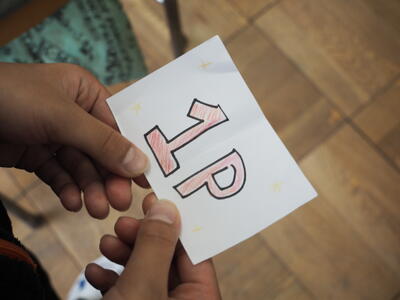 また、今年もポイントの1つとして、「二宮小ボランティア」の方々が、「にのみやいいな&ぼうさいクイズ」のブースを出してくださいました。「吾妻山」「相模湾」「葛川」など、みんなに親しまれている場所を防災の視点からクイズにしたものです。子どもたちは、班のみんなと悩みながら、また協力しながら答えを出していました。